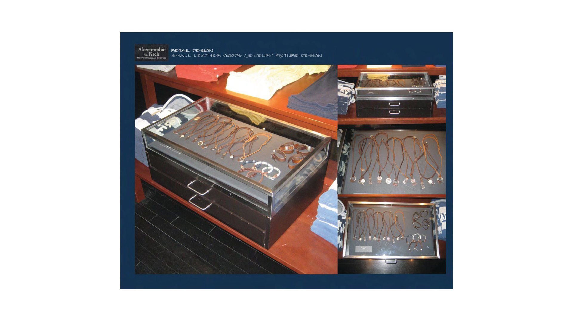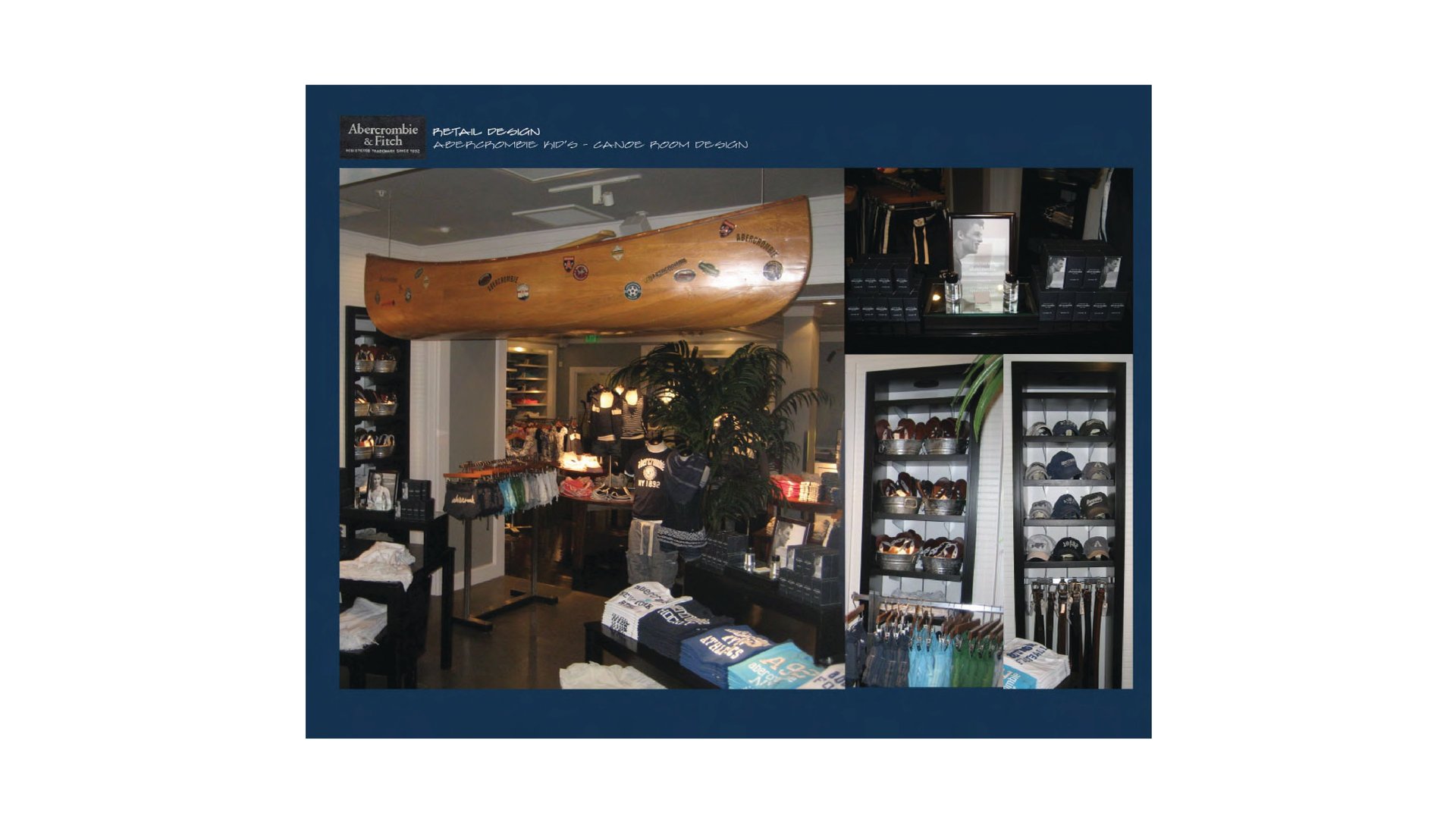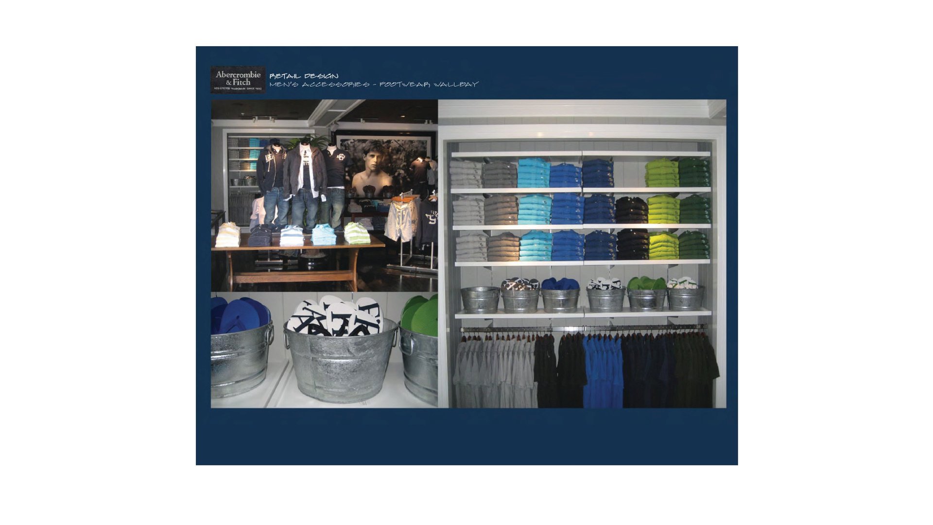 Created Visual Layouts and planogram concepts for A&F and abercrombie kid's Accessory Wallbays. Designed New Fixtures for Jewelry, Belts and Footwear. Additional design work creating seasonal Cashrap and Canoe Room retail store designs.