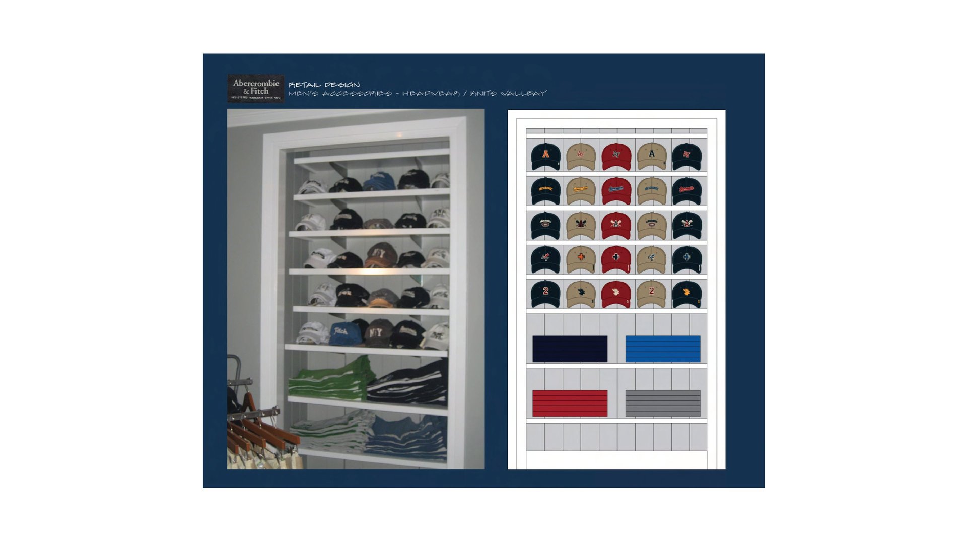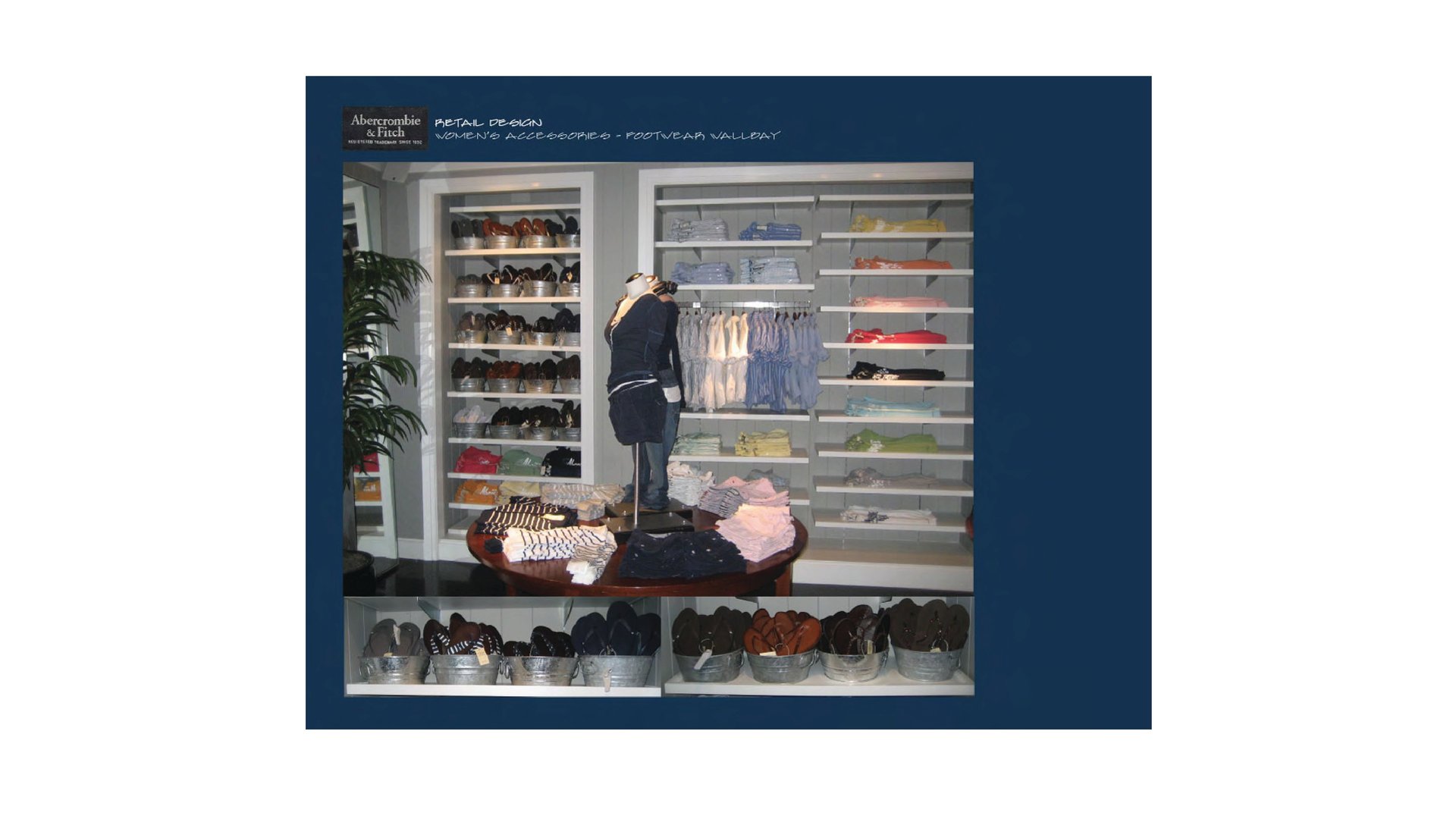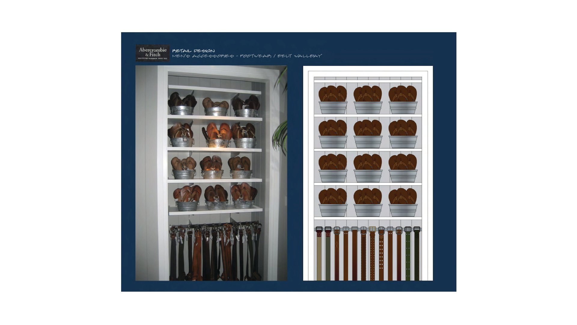 Created Visual Layouts and planogram concepts for A&F and abercrombie kid's Accessory Wallbays. Designed New Fixtures for Jewelry, Belts and Footwear. Additional design work creating seasonal Cashrap and Canoe Room retail store designs.